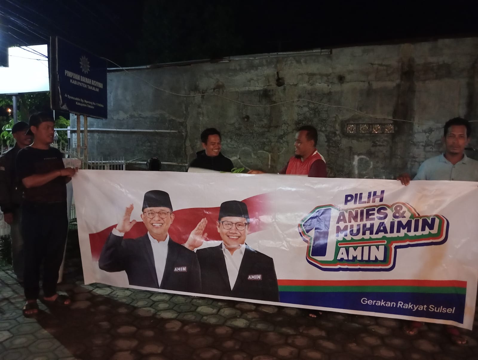 Relawan pasangan nomor urut 1 Anies Baswedan – Muhaimin Iskandar (AMIN) yang tergabung dalam Gabungan Relawan Muda (GARDA) AMIN Takalar melakukan penyebaran alat peraga kampanye berupa spanduk Gerakan Rakyat di seluruh pelosok desa dan kelurahan di Takalar.