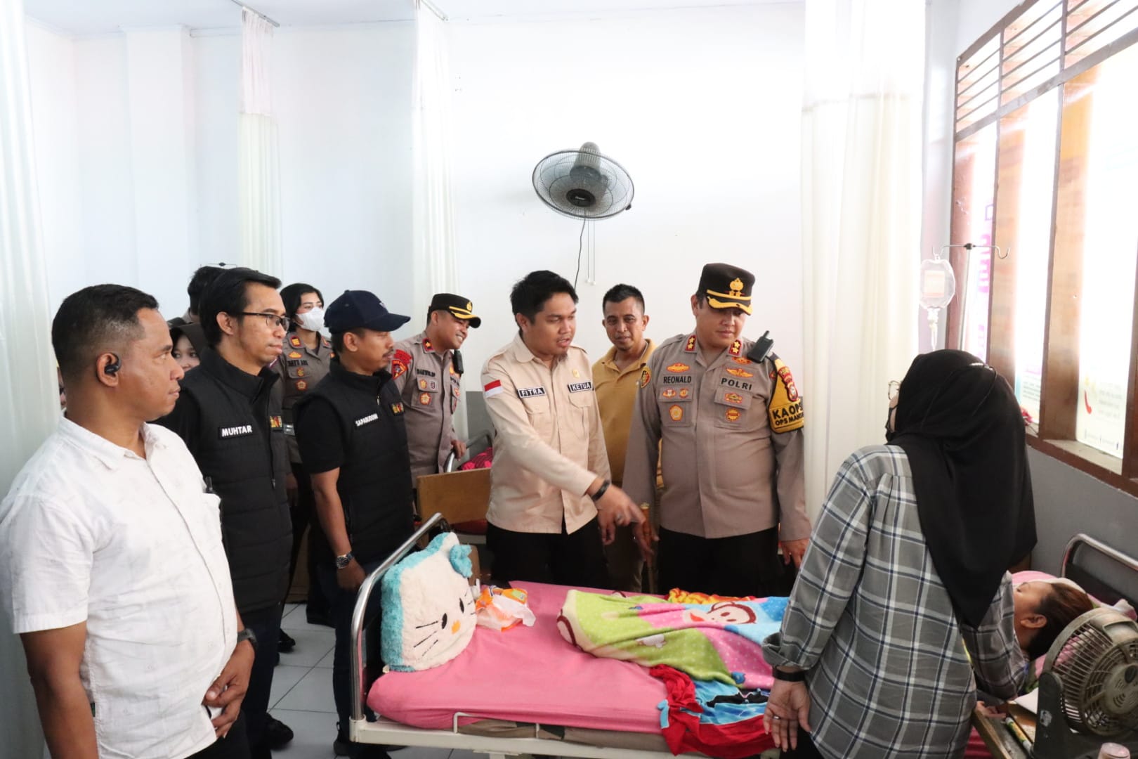 GOWA, SUARASELATAN – Kapolres Gowa AKBP R.T.S Simanjuntak, S.H , S.I.K., M.M., M.I.K menjenguk 2 anggota KPPS yang dirawat di Puskesmas Somba Opu, Jalan Masjid Raya, Sungguminasa Kabupaten Gowa pasca pemilu, Sabtu (24/2) siang.