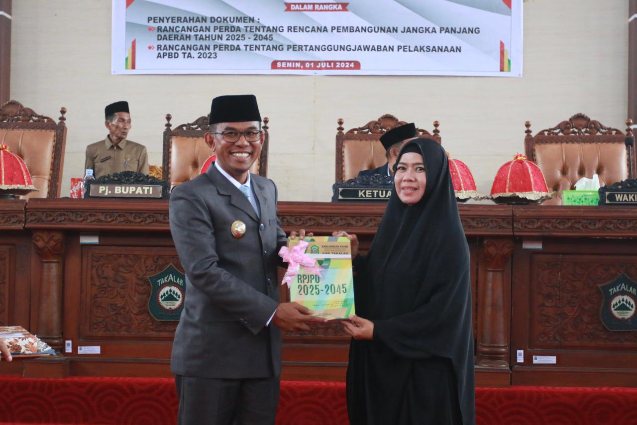 Pada awal rapat, Pj. Bupati secara resmi menyerahkan dokumen Rancangan Perda RPJPD Tahun 2025-2045 kepada DPRD Kabupaten Takalar. Dalam kesempatan itu, beliau juga mengucapkan terima kasih atas pencapaian Kabupaten Takalar dalam laporan keuangan yang disajikan secara wajar sesuai Standar Akuntansi, serta meraih Opini Wajar Tanpa Pengecualian (WTP) dari BPK.