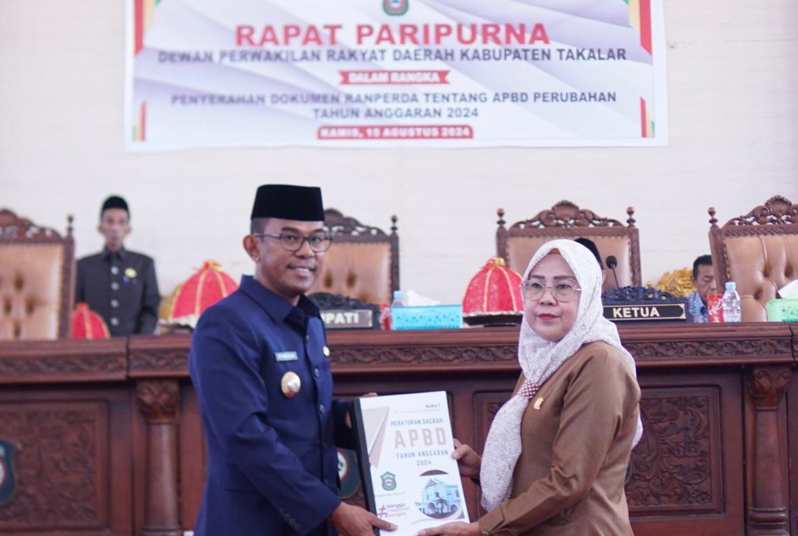 Penyerahan Dokumen Raperda APBD -P tahun anggaran 2024 diserahkan langsung Pj. Bupati Takalar Setiawan Aswad ke Wakil Ketua I DPRD Suarni Nawir pada sidang Paripurna DPRD kabupaten Takalar, yang dipimpin Ketua DPRD Takalar Ir. Darwis Sijaya dihadiri oleh Anggota DPRD dan Pimpinan OPD Takalar, yang bertempat di Ruang Sidang Lt. ll Gedung DPRD Takalar, Kecamatan Pattallassang, Kamis, (15/8/2024).