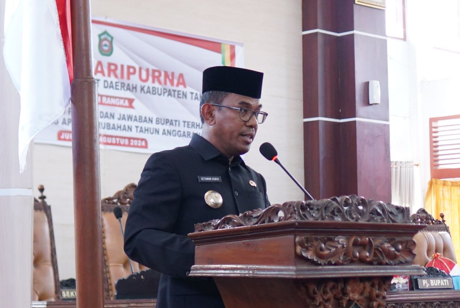TAKALAR, SUARASELATAN – Fraksi-fraksi DPRD Takalar memberikan pandangan umum mereka terhadap Rancangan Peraturan Daerah (Ranperda) tentang APBD Perubahan Tahun Anggaran 2024 yang kemudian dijawab secara langsung oleh Pj. Bupati Takalar, Setiawan Aswad, Dalam rapat paripurna yang berlangsung di ruang sidang Lt. II Gedung DPRD Kabupaten Takalar pada Jumat, (16/08/24).