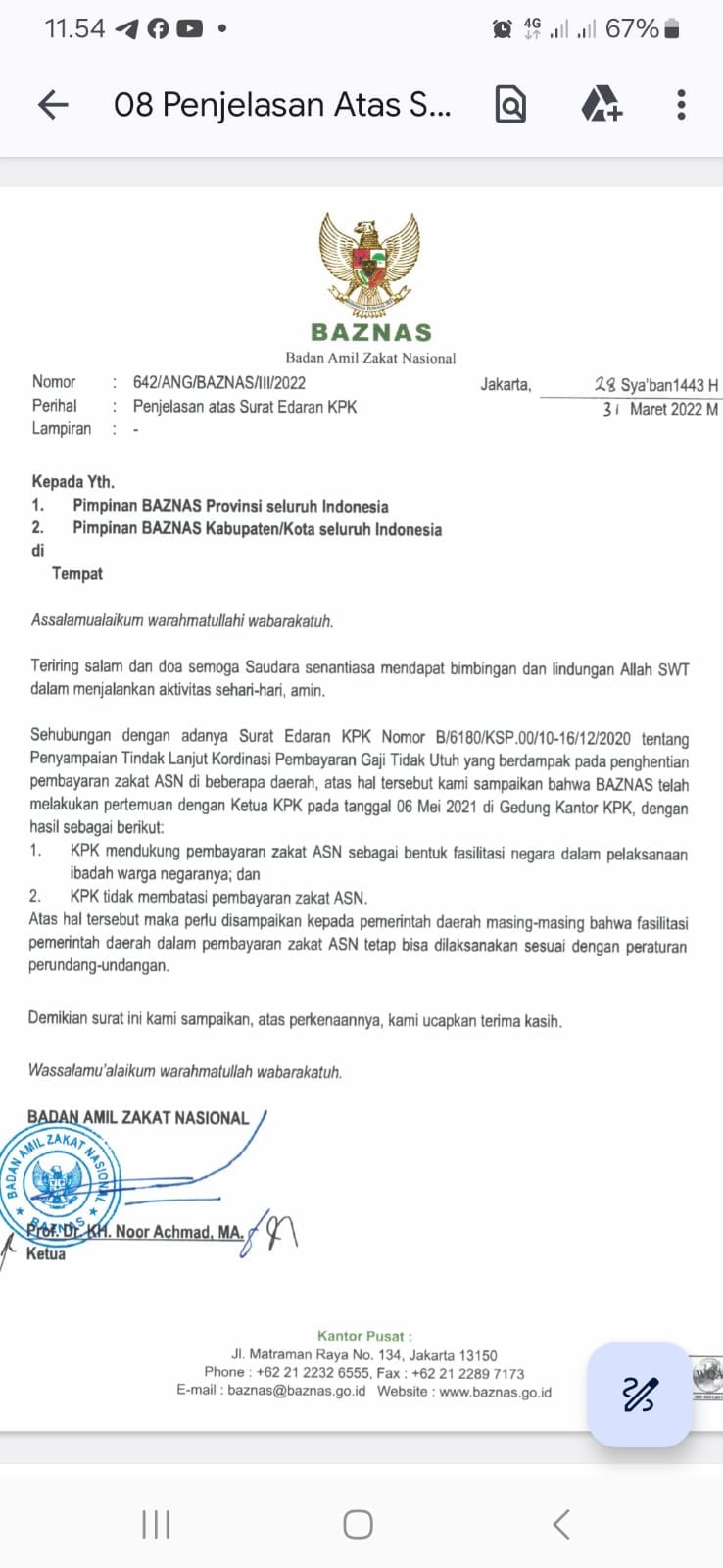 Penyampaian Tindak Lanjut Kordinasi Pembayaran Gaji Tidak Utuh yang berdampak pada penghentian pembayaran zakat ASN di beberapa daerah, atas hal tersebut kami sampaikan bahwa BAZNAS telah melakukan pertemuan dengan Ketua KPK pada tanggal 06 Mei 2021 di Gedung Kantor KPK, dengan