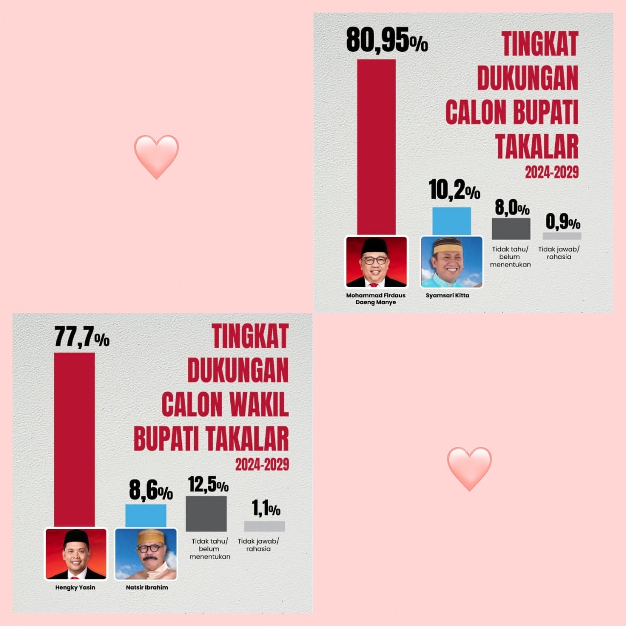 Survei tersebut menunjukkan bahwa pasangan calon bupati nomor urut satu 01 Muhammad Firdaus Daeng Manye dan calon wakil bupati Hengky Yasin (DM-HHY) unggul jauh dibandingkan rivalnya, Syamsari Kitta dan Natsir Ibrahim, menjelang Pilkada Takalar yang akan berlangsung pada 27 November 2024.
