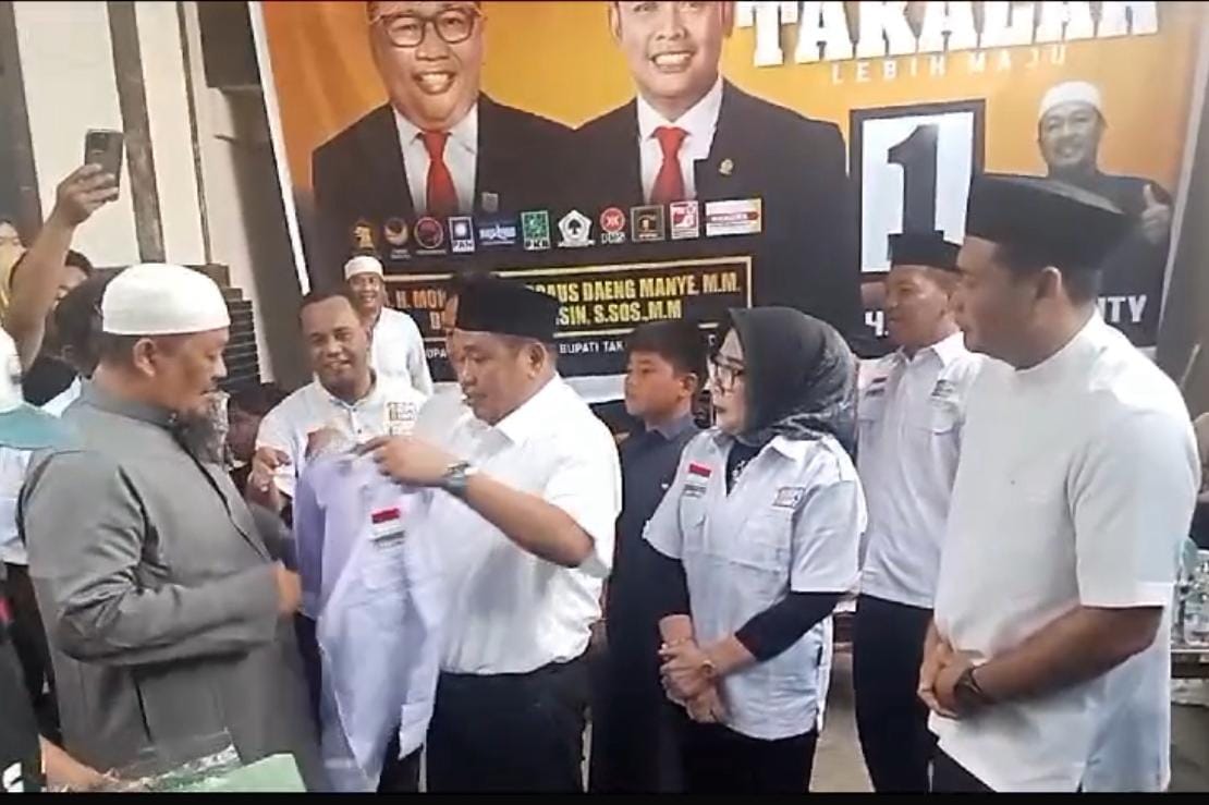 Nampak Dg Manye memakaikan langsung baju tim pemenangan DM-HHY ke H.Tarra yang langsung di iringi dengan teriakan takbir dari semua orang yangbada di dalam ruangan tersebut.
