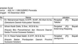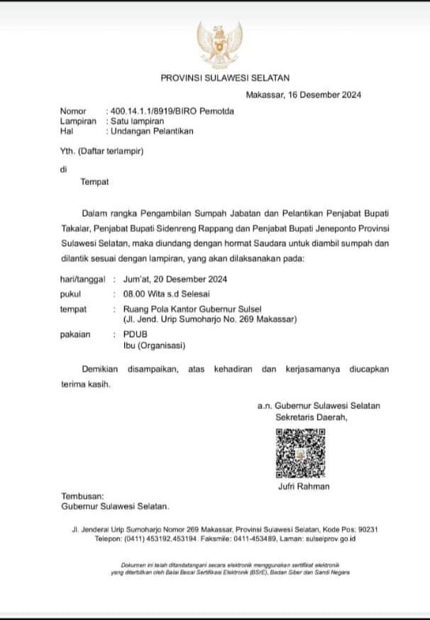 Dalam surat itu dijelaskan bahwa gladi bersih dan pengambilan sumpah jabatan dan pelantikan Pj Bupati Takalar, Pj Sidenreng Rappang (Sidrap) dan Pj Bupati Jeneponto akan dilaksanakan pada hari Kamis (19/12/2024), pukul 14.00 Wita di Ruang Pola Kantor Gubernur Sulsel, Jalan Jend. Urip Sumoharjo No. 269 Makassar.