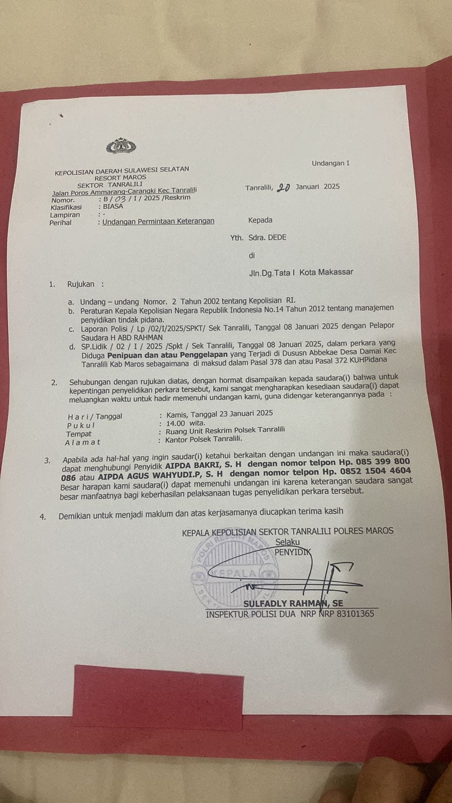 Surat yang ditujukan langsung ke Kapolsek Tanralili, KANIT RESKRIM POLSEK TANRALILI, dan Penyidik Laporan Polisi Nomor : LP/B/02/I/2025/SPKT/SEK.TANRALILI/RES MAROS. LKBH Makassar mengajukan Penyelesaian Laporan Polisi berdasarkan Metode Restorative justice merujuk Peraturan Kepolisian Negera Republik Indonesia yang mengatur tentang Keadilan Restoratif Perpol Nomor 8 Tahun 2021 tentang Penanganan Tindak Pidana Berdasarkan Keadilan Restoratif.