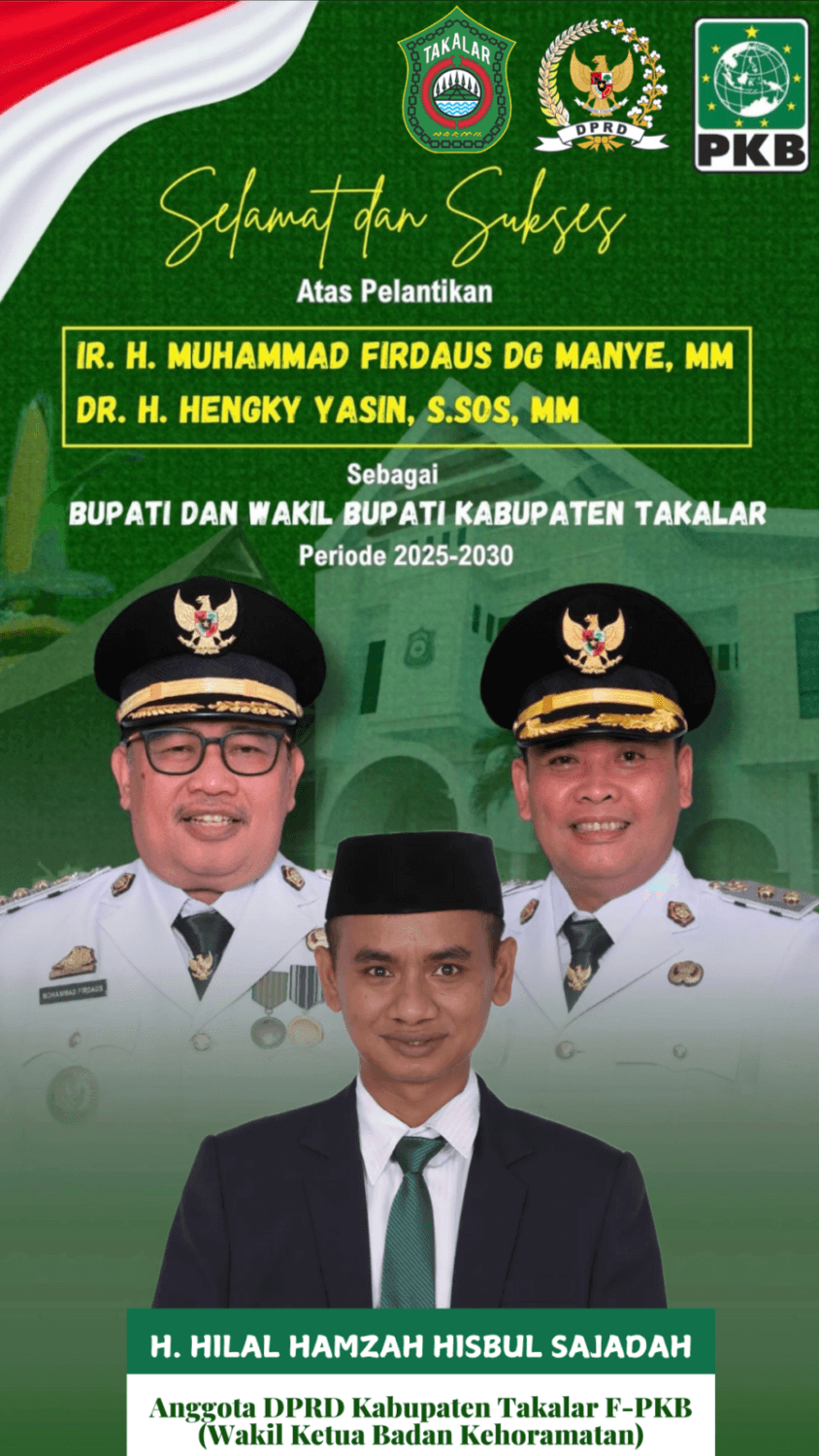 “Selamat dan Sukses Atas dilantiknya, Ir. Mohammad Firdaus Daeng Manye dan H. Hengky Yasin sebagai Bupati dan Wakil Bupati Takalar Periode 2025–2030,” Ucap H. Muda sapaan akrabnya H. Hilal Hamzah Hisbul Sajadah.
