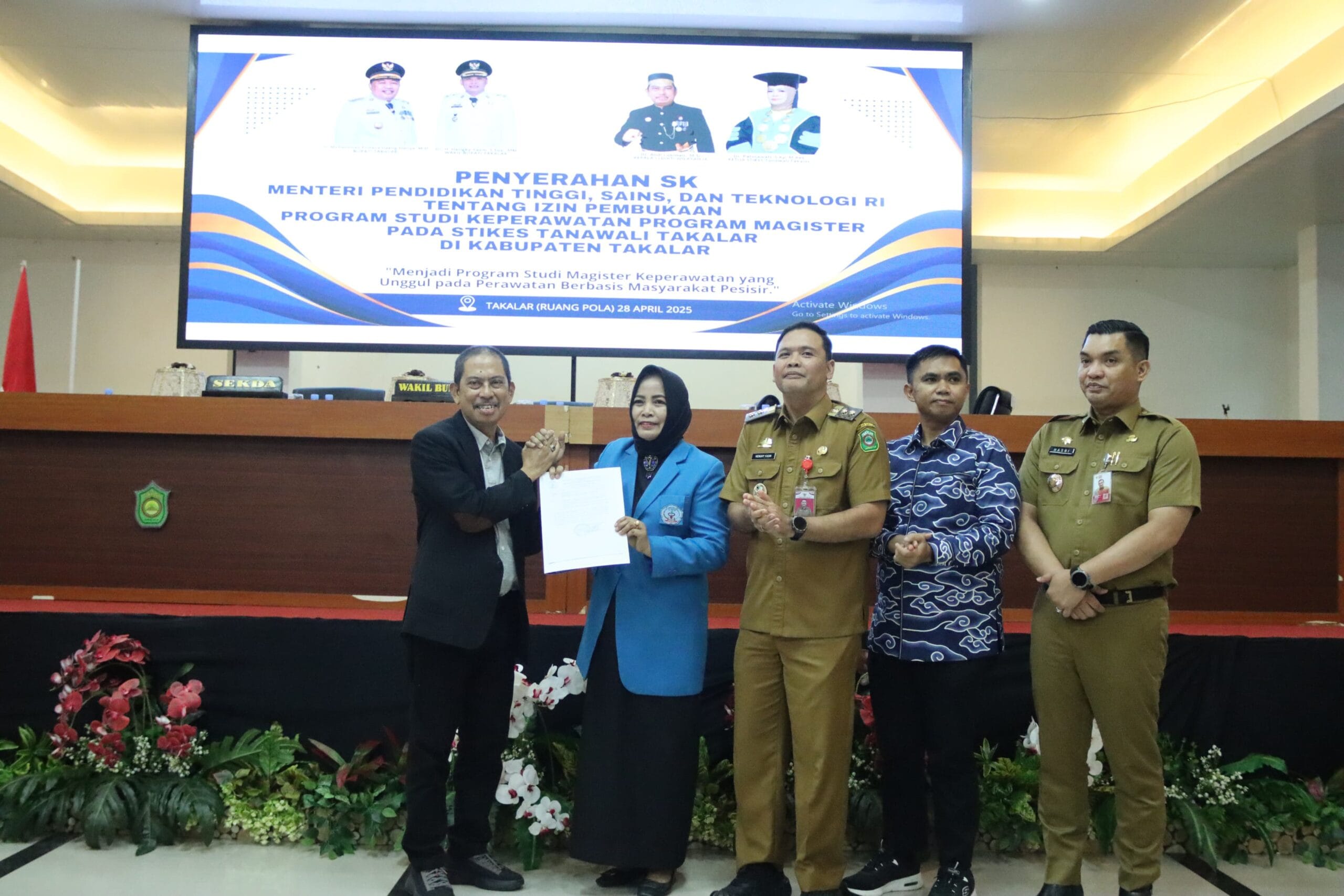 SUARASELATAN, TAKALAR — Wakil Bupati Takalar, Hengky Yasin, didampingi Sekda Takalar, Muhammad Hasib, menyaksikan penyerahan Surat Keputusan (SK) Menteri Pendidikan, Sains dan Teknologi RI Tentang Izin Pembukaan Program Studi Keperawatan Program Magister pada Stikes Tanawali Takalar.