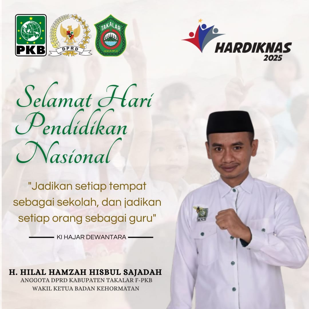 SUARASELATAN, TAKALAR— Anggota DPRD Takalar Fraksi PKB, H. Hilal Hamzah Hisbul Sajadah mengucapkan selamat Hari Pendidikan Nasional 2 Mei Tahun 2025.