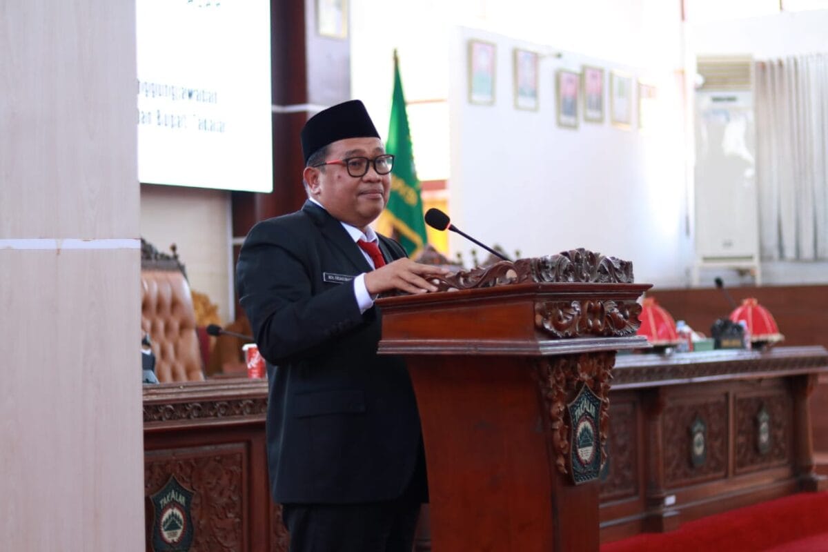 Dalam sambutannya Bupati mengatakan diantaranya berdasarkan Peraturan Pemerintah Nomor 12 Tahun 2019 tentang Pengelolaan Keuangan Daerah Pasal 194 dijelaskan bahwa Kepala Daerah wajib menyampaikan Rancangan Peraturan Daerah tentang Pertanggungjawaban Pelaksanaan APBD kepada DPRD, berupa laporan keuangan yang telah direview inspektorat kabupaten serta telah diaudit oleh Badan Pemeriksa Keuangan (BPK) Republik Indonesia.