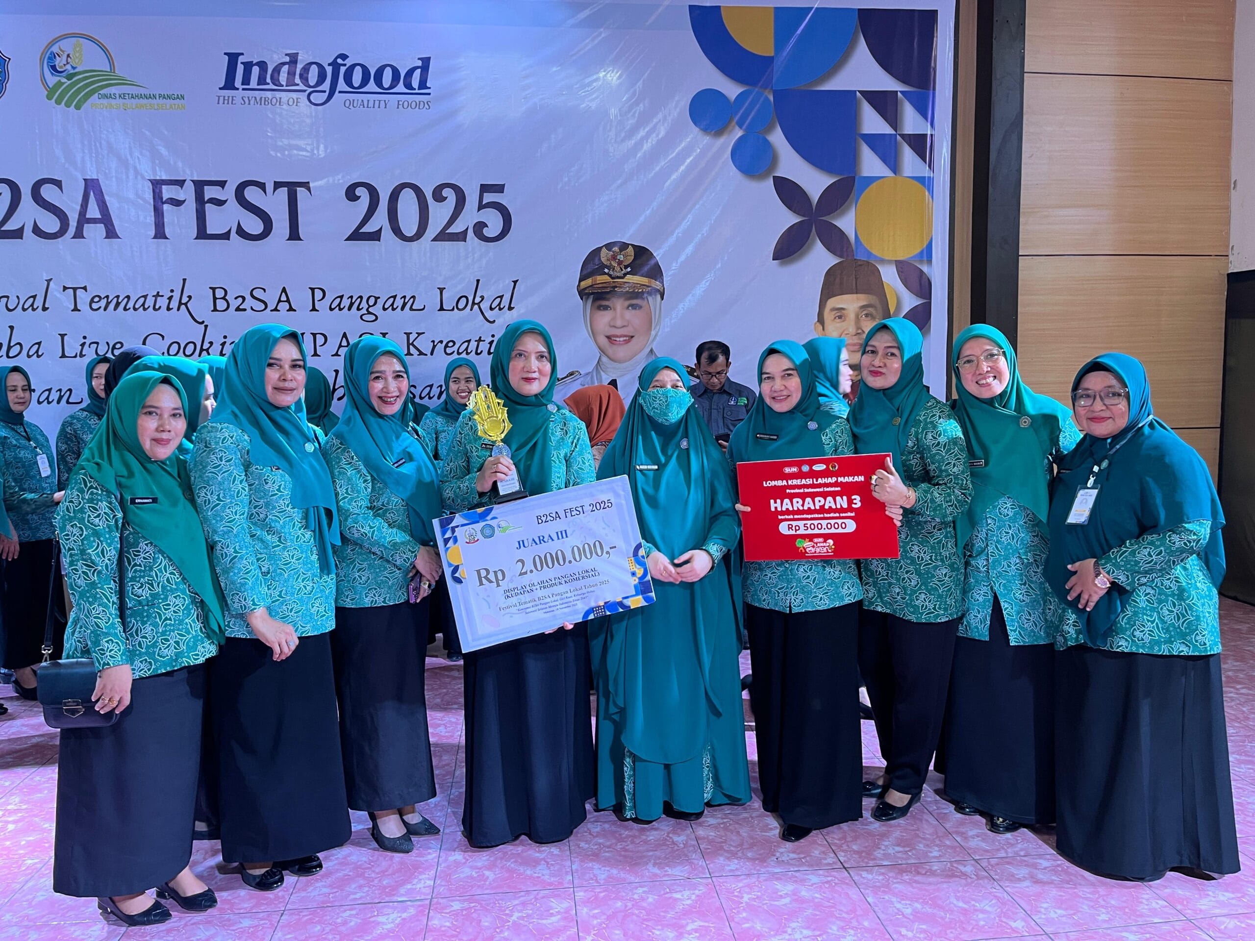SUARASELATAN.com, Makassar -. Tim Penggerak PKK Kabupaten Takalar kembali menorehkan prestasi dengan meraih Juara 3 dalam Lomba Olahan Pangan Lokal (Kudapan Produk Komersial) dan Harapan 3 Lomba Kreasi Lahap Makan di ajang B2SA Fest 2025 yang diselenggarakan di Gedung Mulo Makassar. Selasa 18 November 2025.