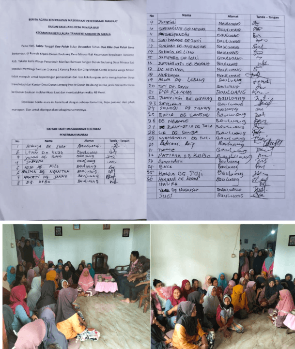 Berita Acara Kesepakatan yang dibuat pada hari Sabtu, 20 Desember 2025 di rumah Kepala Dusun Bauluang menyatakan bahwa penerima manfaat sepakat membagikan 1 karung beras dan 2 liter minyak kelapa kepada warga miskin yang tidak mendapat bantuan, serta membayar uang transportasi dari kantor desa ke Dusun Bauluang. Berita acara tersebut dibuat dengan sebenar-benarnya, tanpa paksaan dari pihak manapun.