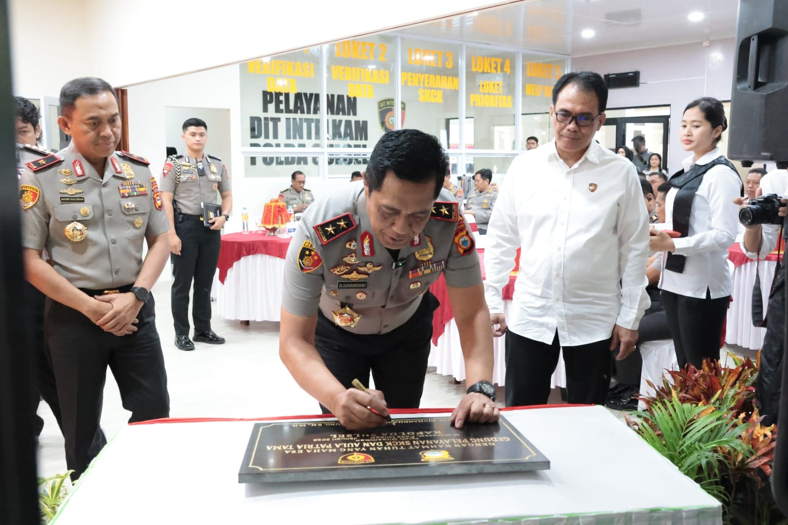 Sebagai simbol peresmian, Kapolda Sulsel melakukan penandatanganan prasasti Ruang Pelayanan SKCK, didampingi Wakapolda Sulsel, Irwasda, dan Direktur Intelkam Polda Sulsel.