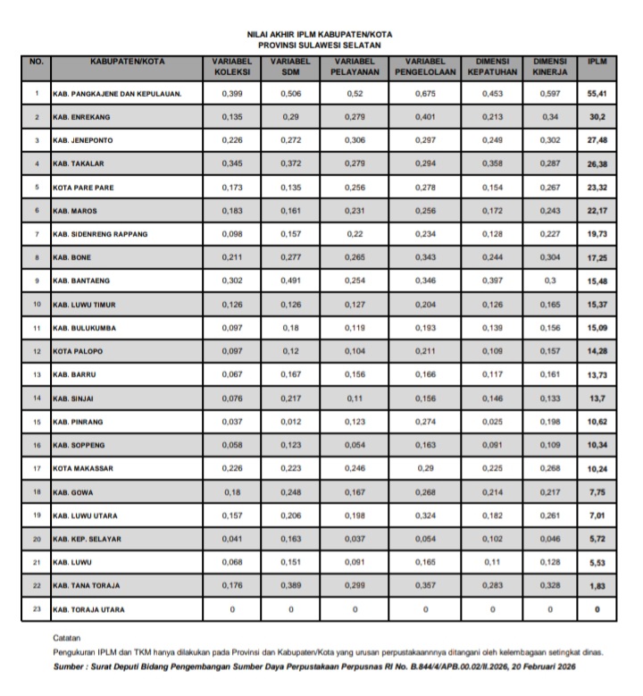 Berdasarkan Surat Deputi Bidang Pemgembangan Sumber Daya Perpustakaan No. B.844/4/APB.00.02/II.2026 tanggal 20 Februari 2026 yang diterbitkan Perpustakaan Nasional RI, Nilai IPLM Kabupaten Takalar Tahun 2025 mencapai 26,38.